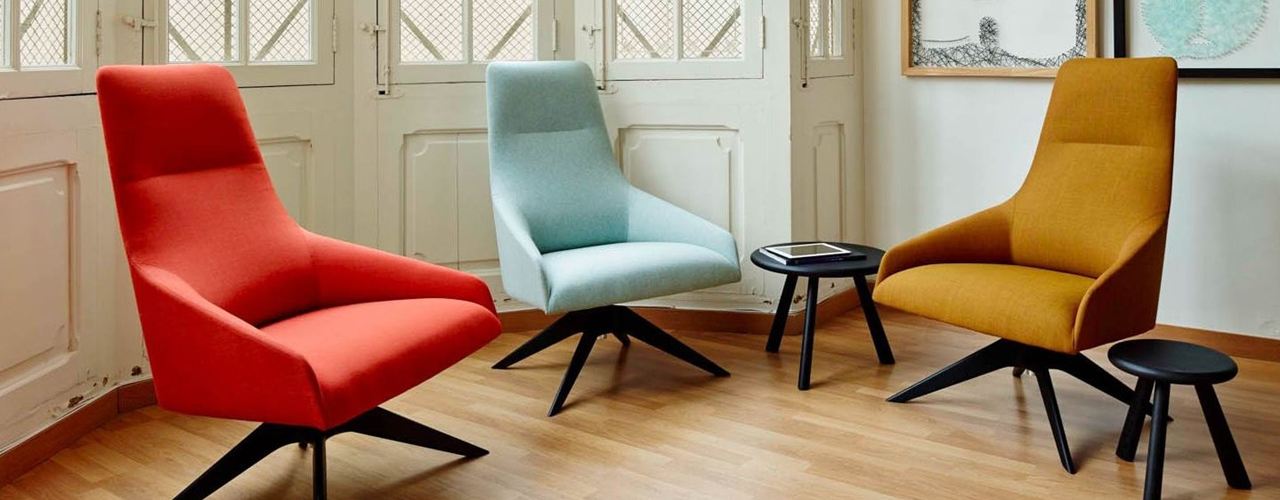 Кресла Alya доступны в различных вариантах отделки и обивки. Центральное основание из алюминия или дерева обеспечивает устойчивость и стильный вид. Автоматический возврат сидения — дополнительное удобство.