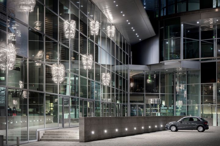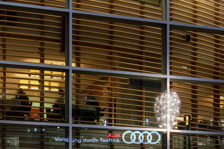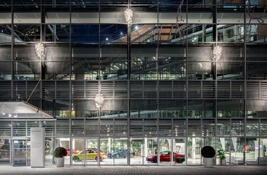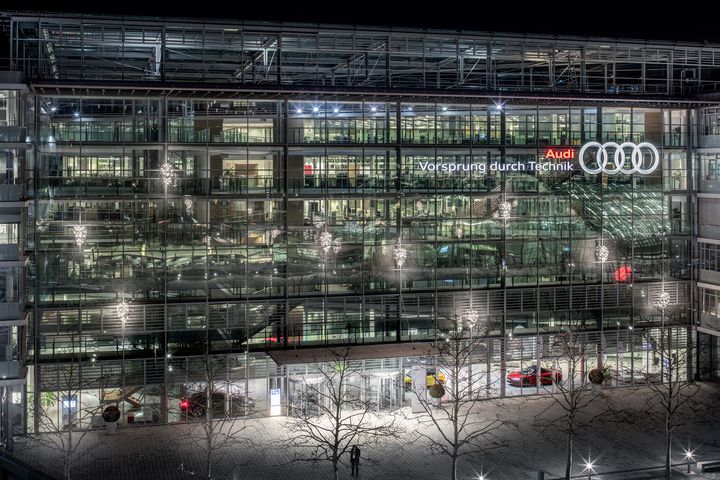 Для освещения фасада штаб-квартиры Audi использовались светильники Fil de Fer от Catellani & Smith, известные своей долговечностью и уникальным дизайном.