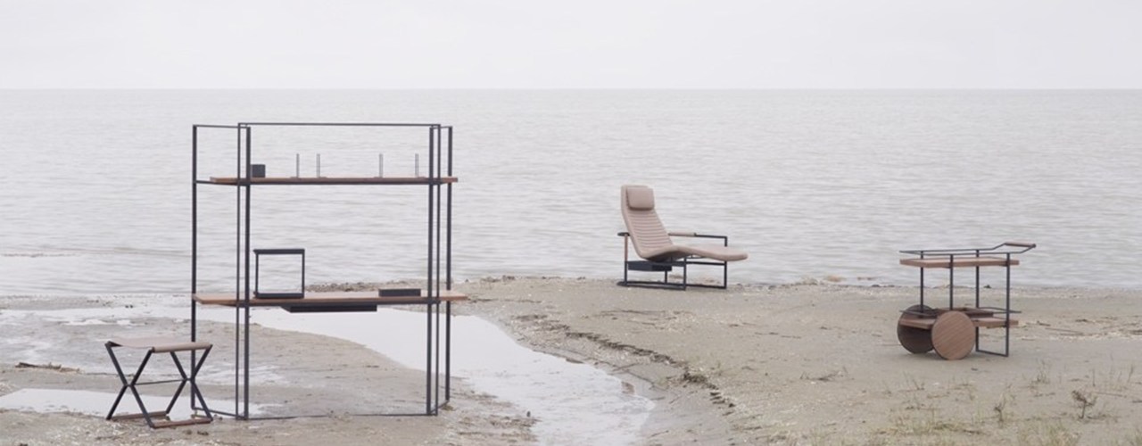 В коллекции используются чёрный металл, ореховое дерево и матовая кожа.