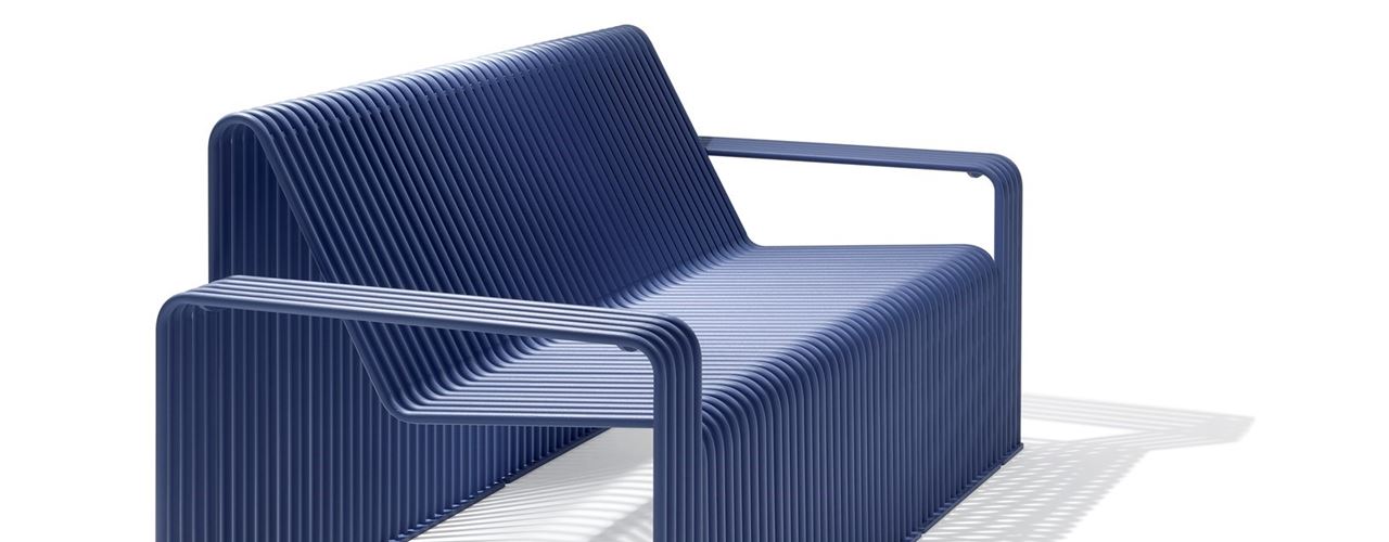 На выставке представлены скамьи и стулья, изготовленные из перерабатываемых материалов, что подчеркивает экологический подход компании.