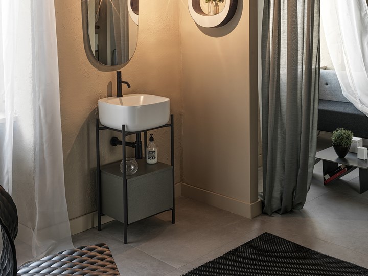 Коллекция включает умывальники с металлической конструкцией, доступной в матовом черном, сером и голубовато-сером цветах. Полки и ящики выполнены из натуральной древесины, доступной в нескольких вариантах отделки.