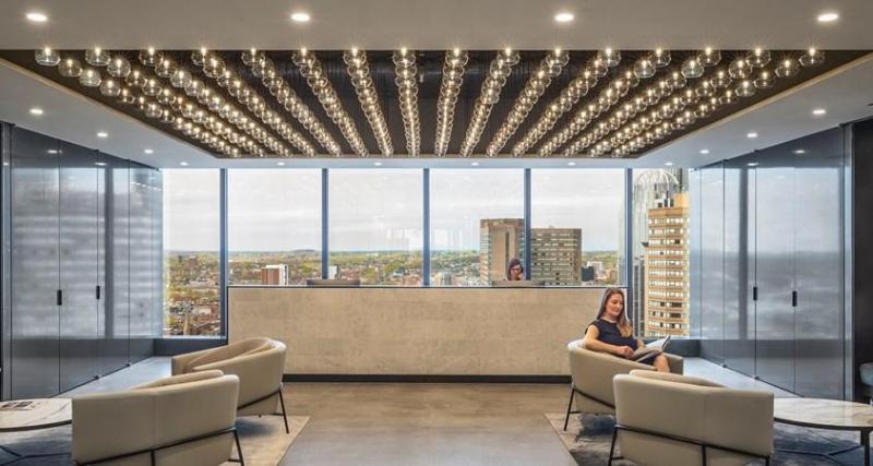 Система освещения включает 175 подвесок для холла лифта и 256 для офиса, что позволяет создать уникальный световой эффект и подчеркнуть архитектурные особенности.