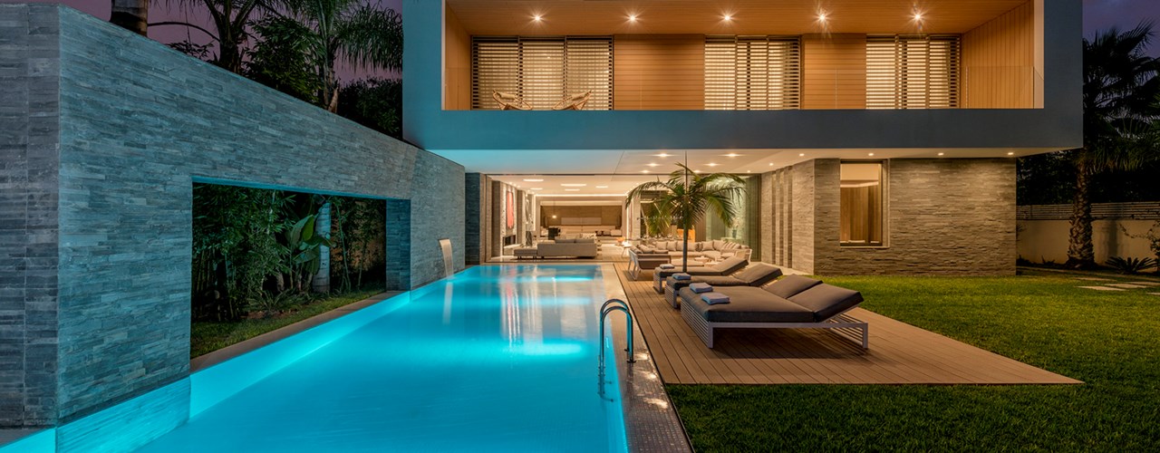 На вилле R использованы холодные кровати, диваны и модульная мебель, которые создают гармоничное пространство для отдыха.