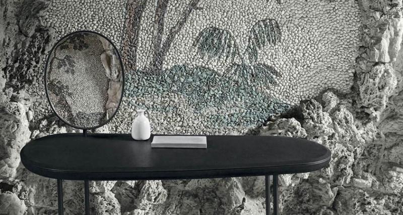 Стол Pebble отличается изысканными деталями, такими как лакированная или кожаная столешница, зеркальные элементы и уникальная форма, напоминающая камни.