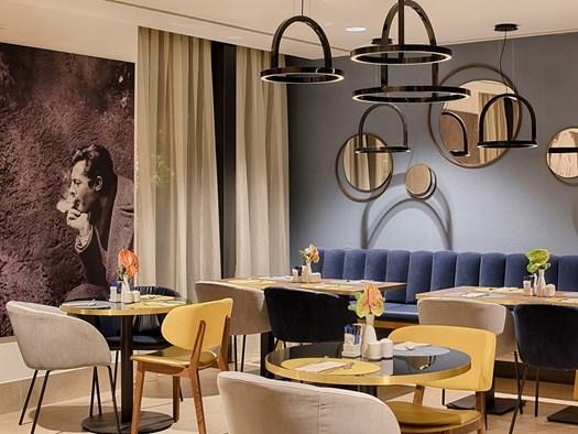 Кресла Electa и Rosie Soft создают уютные уголки для отдыха, а стулья Claire и столы Calligaris создают атмосферу изысканности и комфорта.