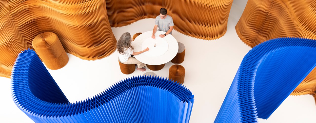 Модульные системы от Molo включают перегородки, сидения и столы, которые могут быть адаптированы под любые нужды офиса.