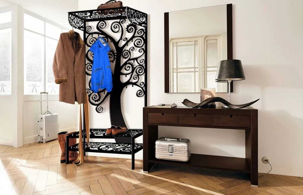 Существуют угловые вешалки, стойки на колесиках, модели с обувницами и дизайнерские варианты на заказ.