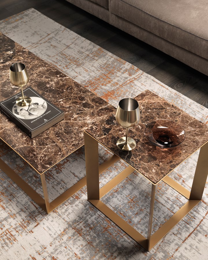 Коллекция Frame предлагает столики с прочной конструкцией и возможностью выбора материалов столешницы, включая металл и мрамор. Угол элементов под 45° создает уникальный визуальный эффект.