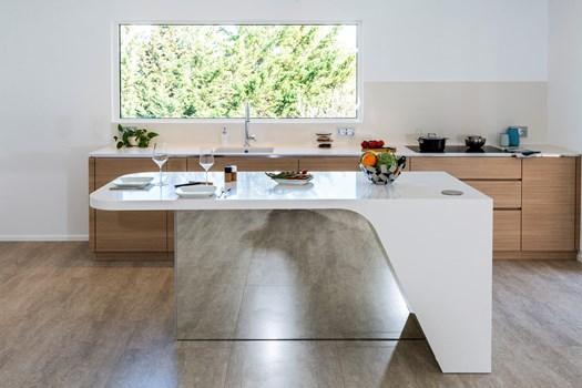 Кухонный остров от Hegenbart с использованием HI-MACS отличается возможностью термоформовки, что позволяет создавать закругленные и плавные формы. Это не только эстетично, но и функционально, так как позволяет экономить пространство и обеспечивает удобный доступ ко всем частям острова.