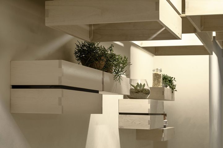 Для создания подвесных конструкций использовалась древесина павловнии, известная своей легкостью, что упростило процесс установки. Остальные элементы интерьера выполнены из американского твердого клена, который придает помещению светлый и мягкий вид.