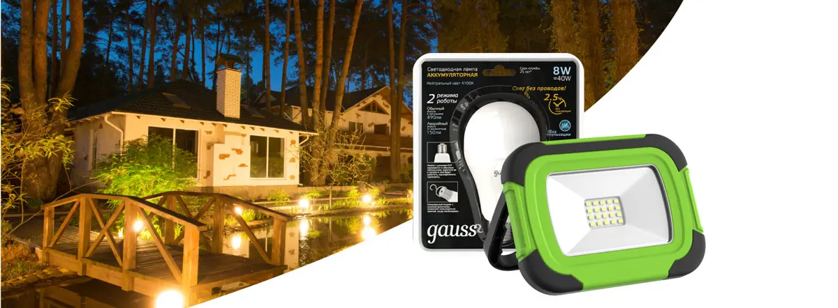 - Переносные лампы с аккумулятором: например, модель Gauss с возможностью работы до 2,5 часов без сети. Оснащена крючком для подвеса в беседках или на веранде.