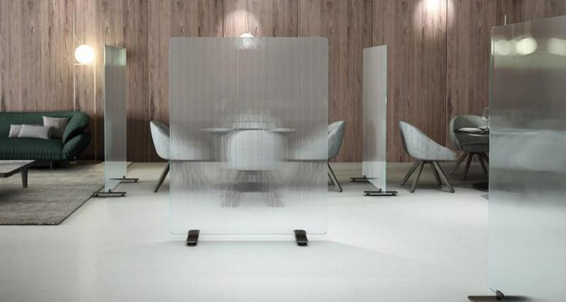 Панели доступны в различных вариантах отделки, включая лакированные и полупрозрачные стекла. Они легко адаптируются под любые требования благодаря съемным основаниям и мобильности.
