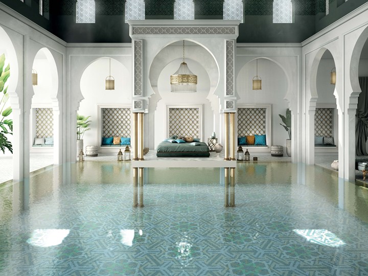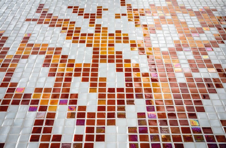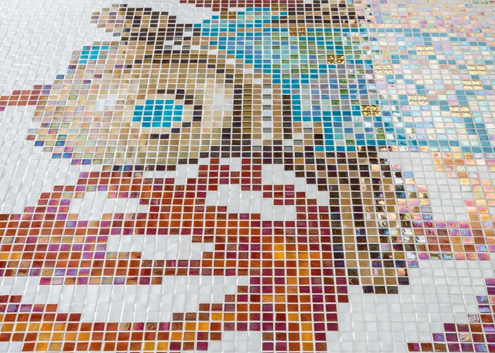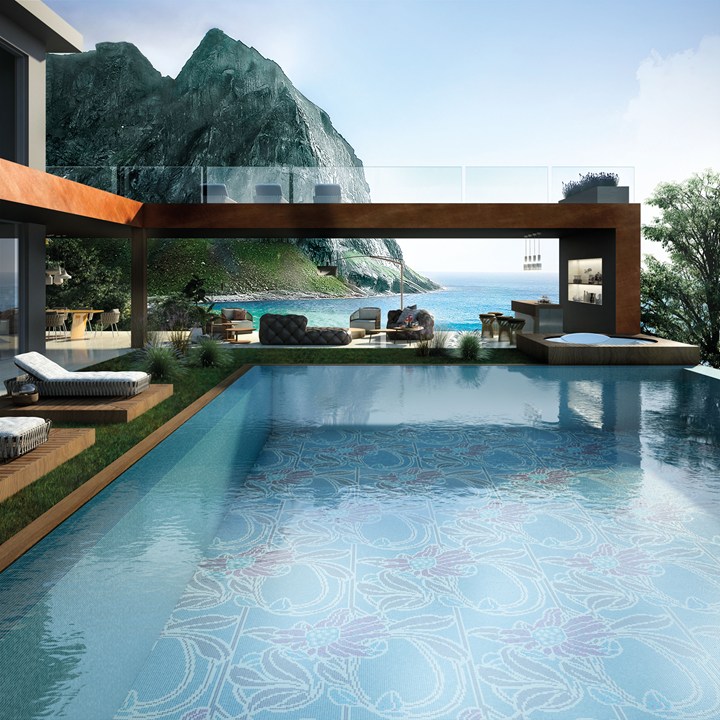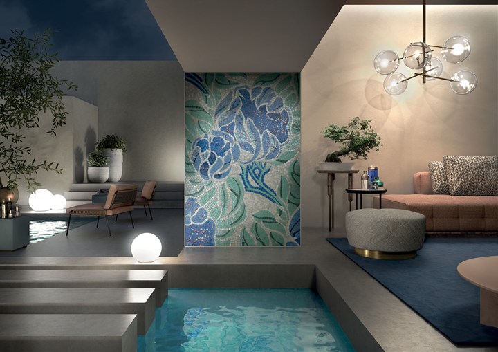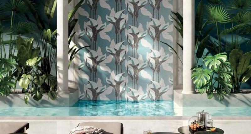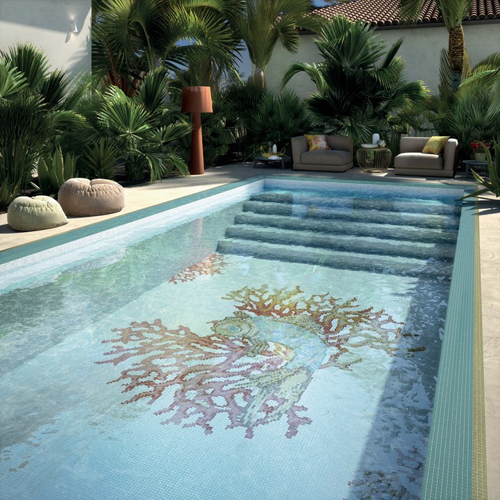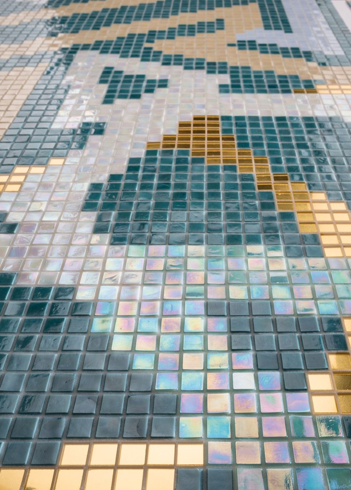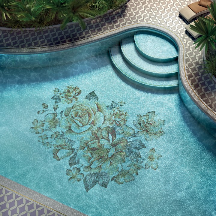 Мозаика Royal Waves устойчива к воде, сохраняет яркость цвета и подходит для изогнутых поверхностей.