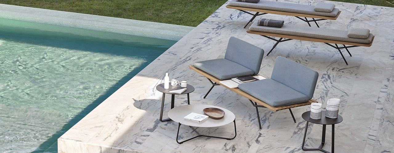 Основные элементы выполнены из экзотического дерева ироко, алюминия с порошковым покрытием и мрамора, что обеспечивает долговечность и стиль. Среди моделей — низкие скамьи, шезлонги и диваны, доступные в различных цветах и конфигурациях.