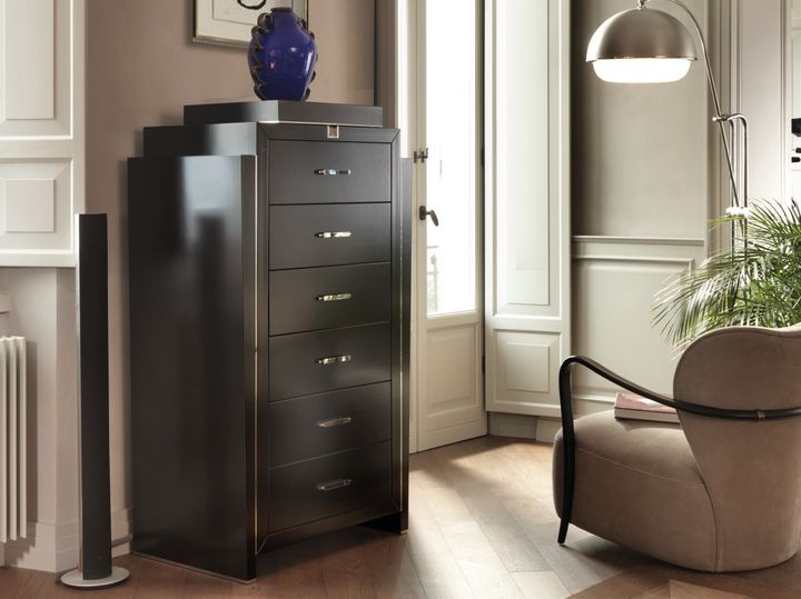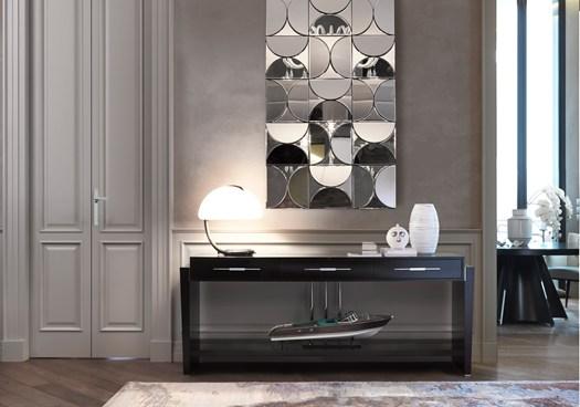 Коллекция Gatsby включает темное дерево, драгоценные ткани и хромированные вставки.