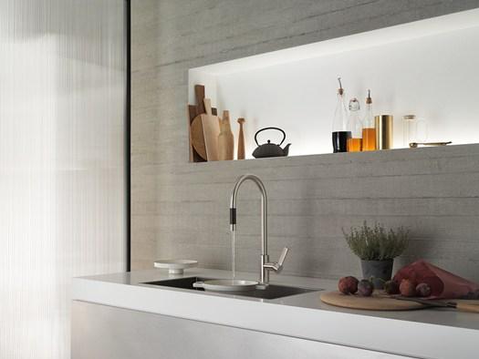 Sync оснащен функцией поворота на 360 градусов и высоким расположением излива. Tara Ultra предлагает выдвижной излив для большей свободы движений. Pivot отличается длинной штангой для использования в любой кухонной зоне.