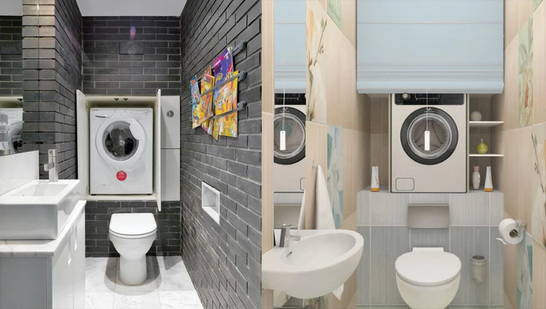 Одним из интересных решений является установка стиральной машины над унитазом. Это позволяет экономить место, но требует тщательной подготовки и надёжной конструкции.