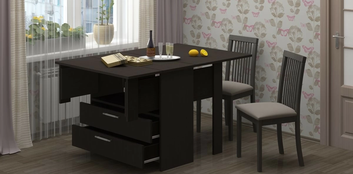 Раскладные столы-тумбы позволяют увеличить рабочую поверхность при необходимости. Модели с ящиками удобны для хранения кухонной утвари.