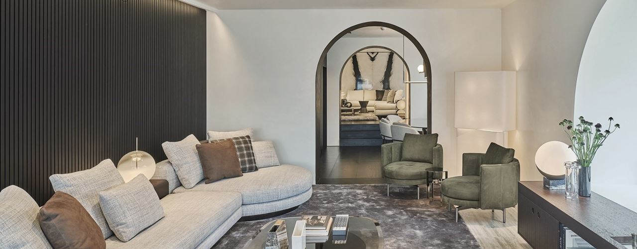 В магазине представлены последние коллекции Minotti, включая Connery и Blazer.