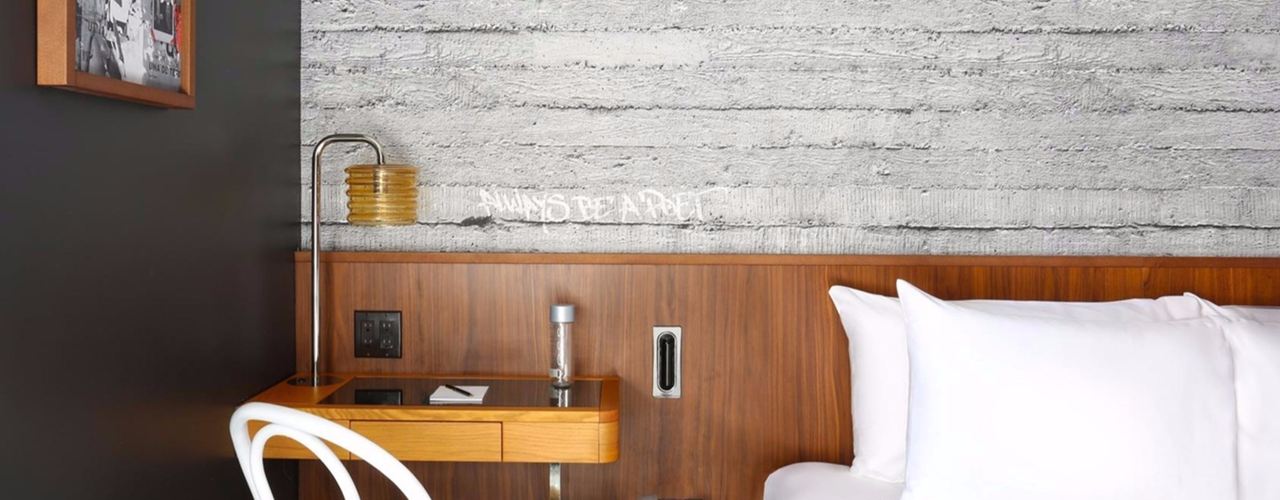 Спальни отеля оформлены в индустриальном стиле с элементами из бетона и граффити, создающими атмосферу городской элегантности.