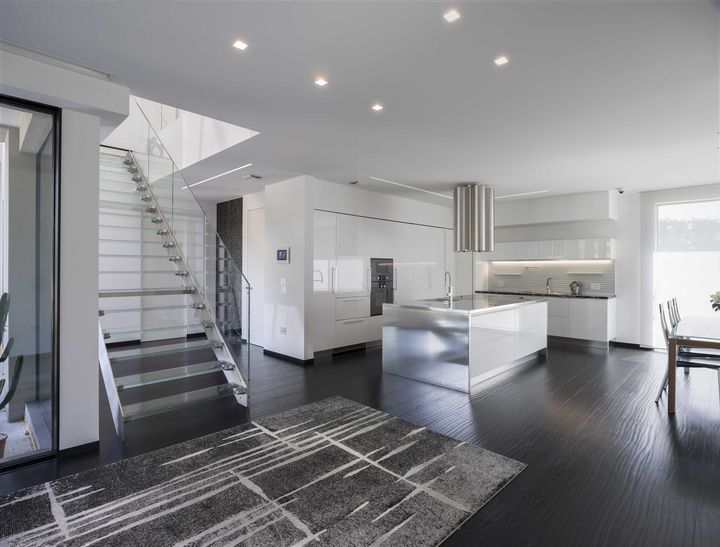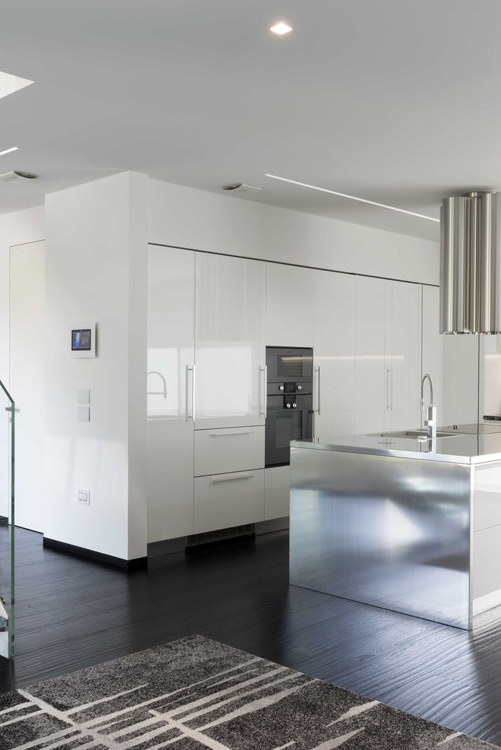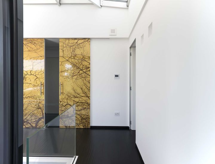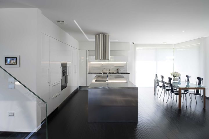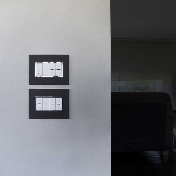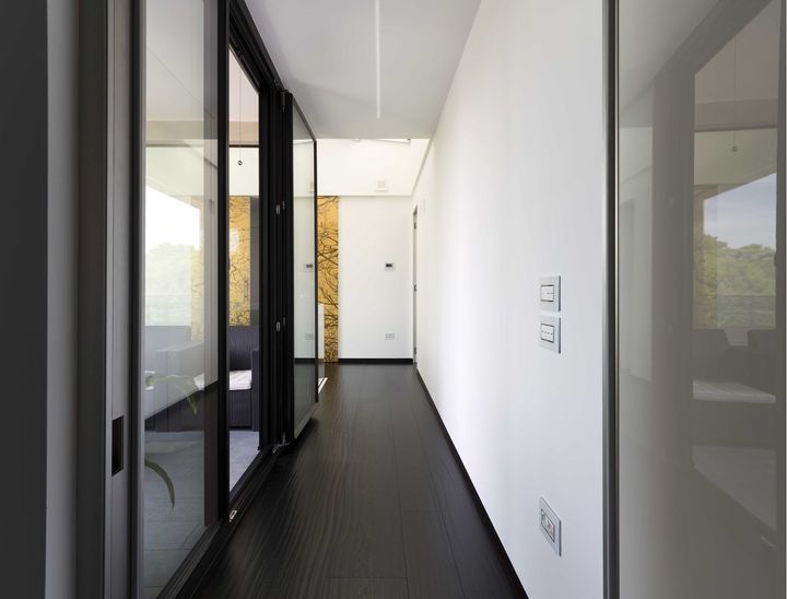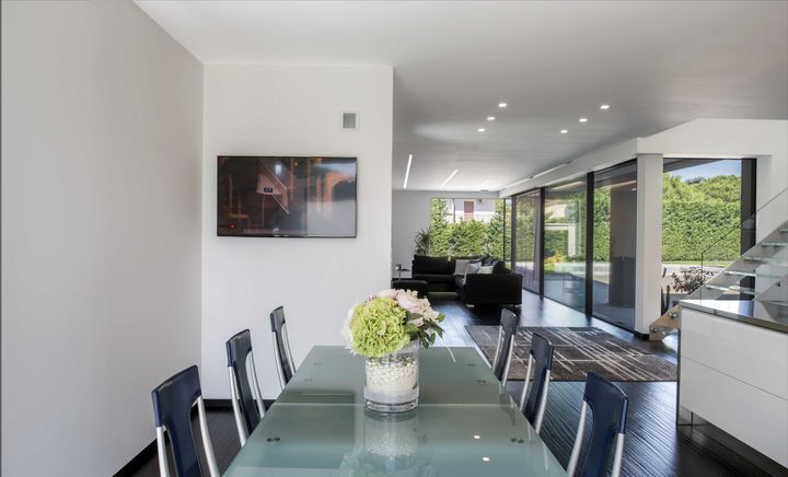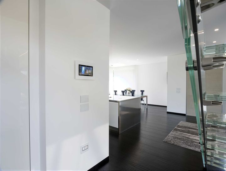 На вилле используются передовые технологии управления, включая сенсорные панели и видеодомофоны Elvox, которые обеспечивают безопасность и удобство. Эти устройства легко интегрируются в общий дизайн дома, подчеркивая его эстетическую привлекательность.