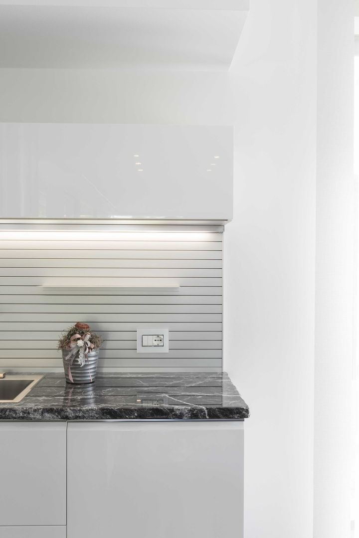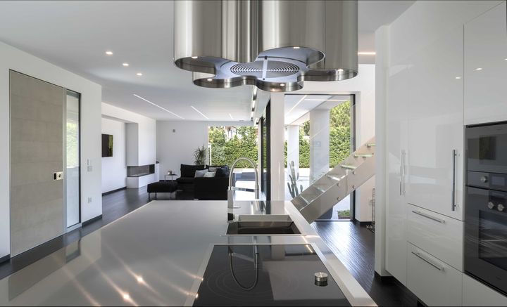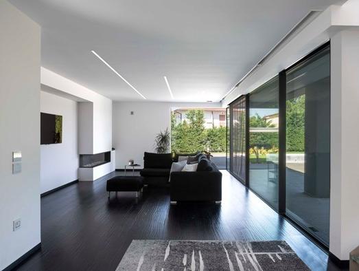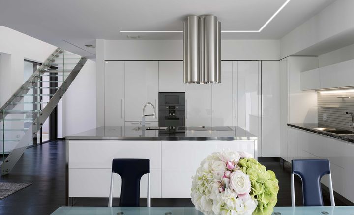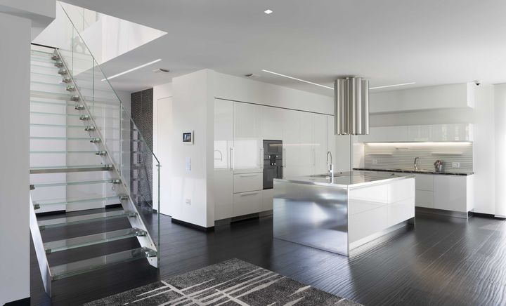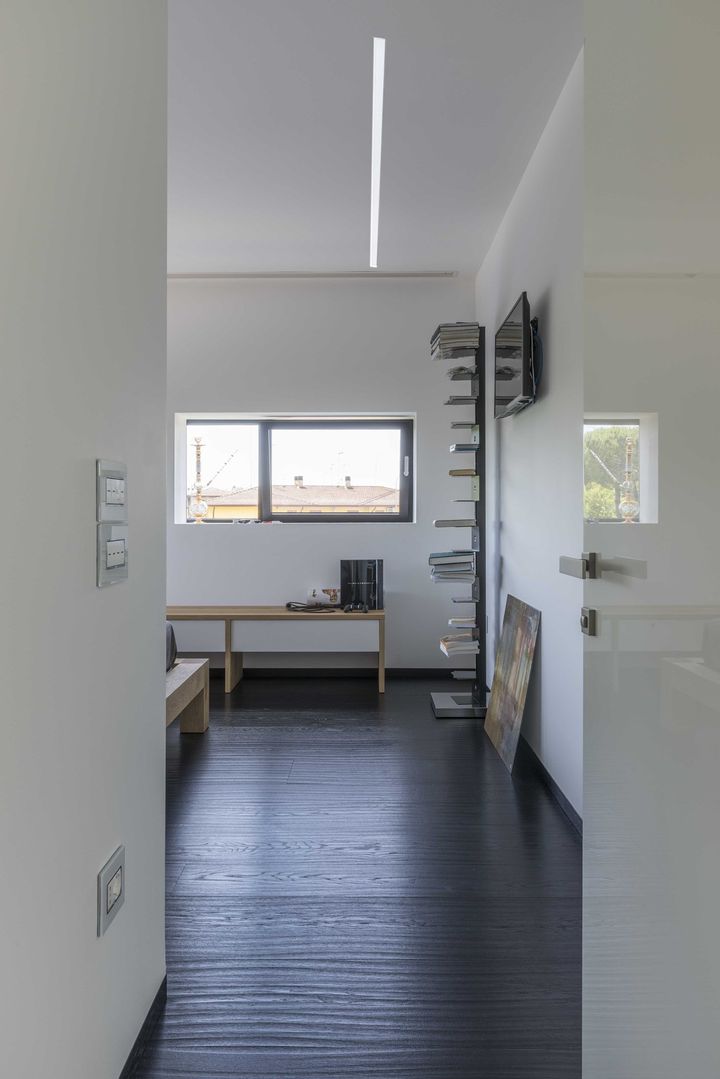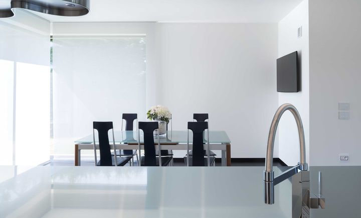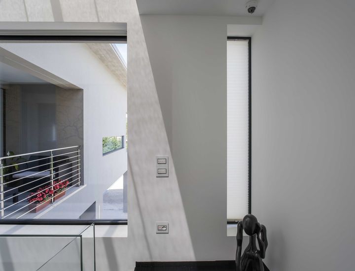 На вилле используются передовые технологии управления, включая сенсорные панели и видеодомофоны Elvox, которые обеспечивают безопасность и удобство. Эти устройства легко интегрируются в общий дизайн дома, подчеркивая его эстетическую привлекательность.