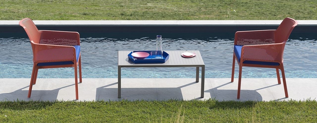 Коллекция Net включает мебель, идеально подходящую для использования на открытом воздухе, в ярких и насыщенных оттенках живого коралла.