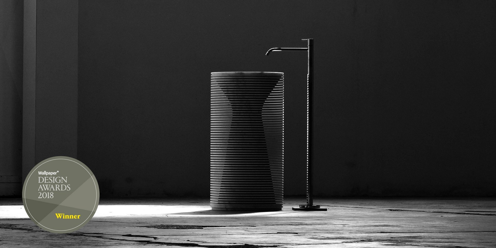 Идея этого умывальника родилась при наблюдении за грубой обработкой мраморных скульптур, в которой трехмерная форма скульптуры очерчена последовательными ступенями и на разной глубине алмазного диска, управляемого машиной с числовым программным управлением.