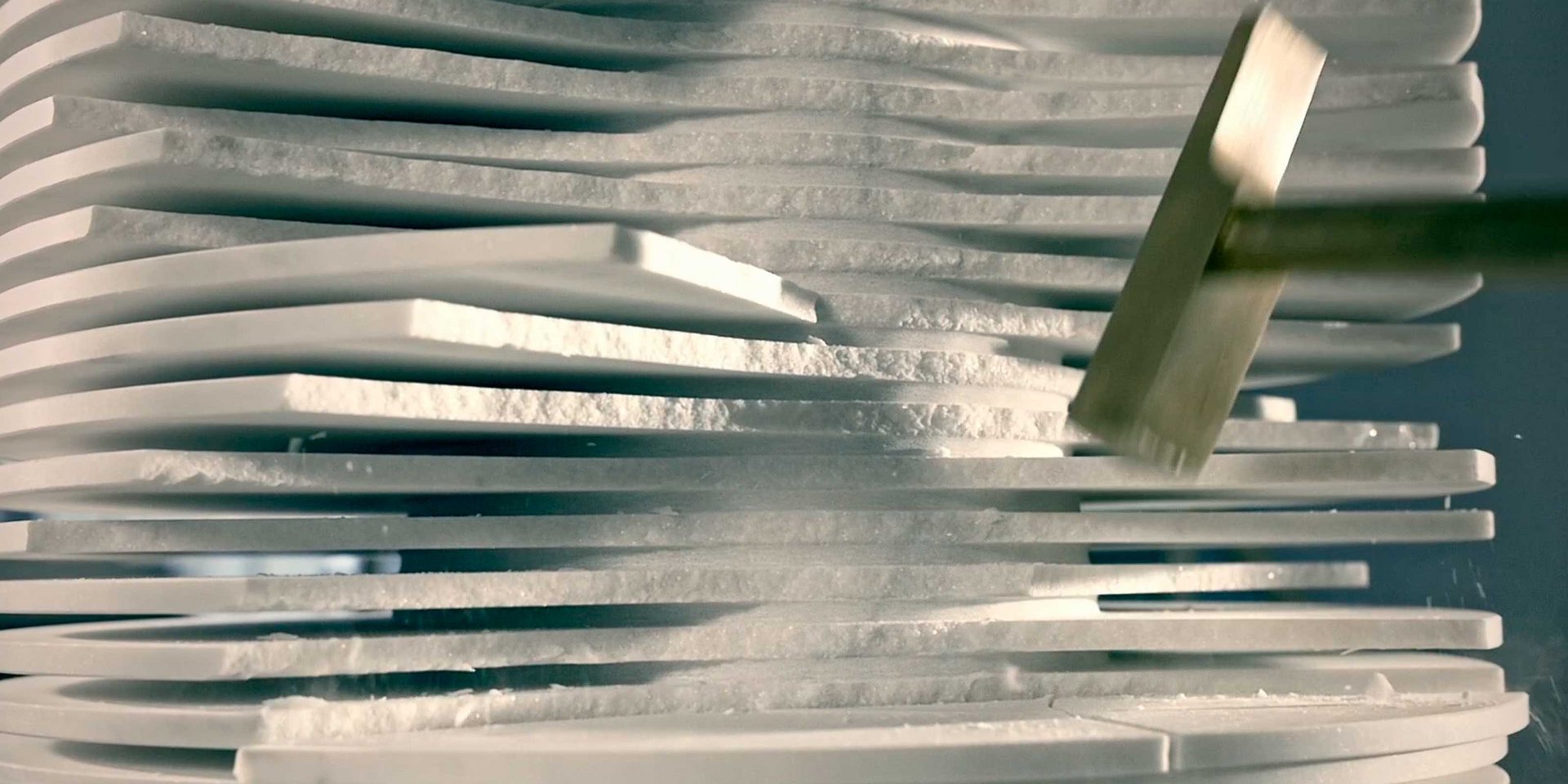 Тот же процесс используется для изготовления умывальника Introverso из цельного блока белого каррарского мрамора. Здесь пустые промежутки между прорезями позволяют заглянуть в другую внутреннюю душу, которую вы можете решить оставить скрытой или выявить, частично или частично разбив ее. полностью обработать ламели молотком, в последнем случае возникшая новая форма будет характеризоваться поверхностным декором, создаваемым разрушением мрамора. Эта серия разрезов позволяет получить четкое физическое и визуальное освещение умывальника, мрамор теряет свойственную монолитность и превращается в нечто воздушное и почти прозрачное.