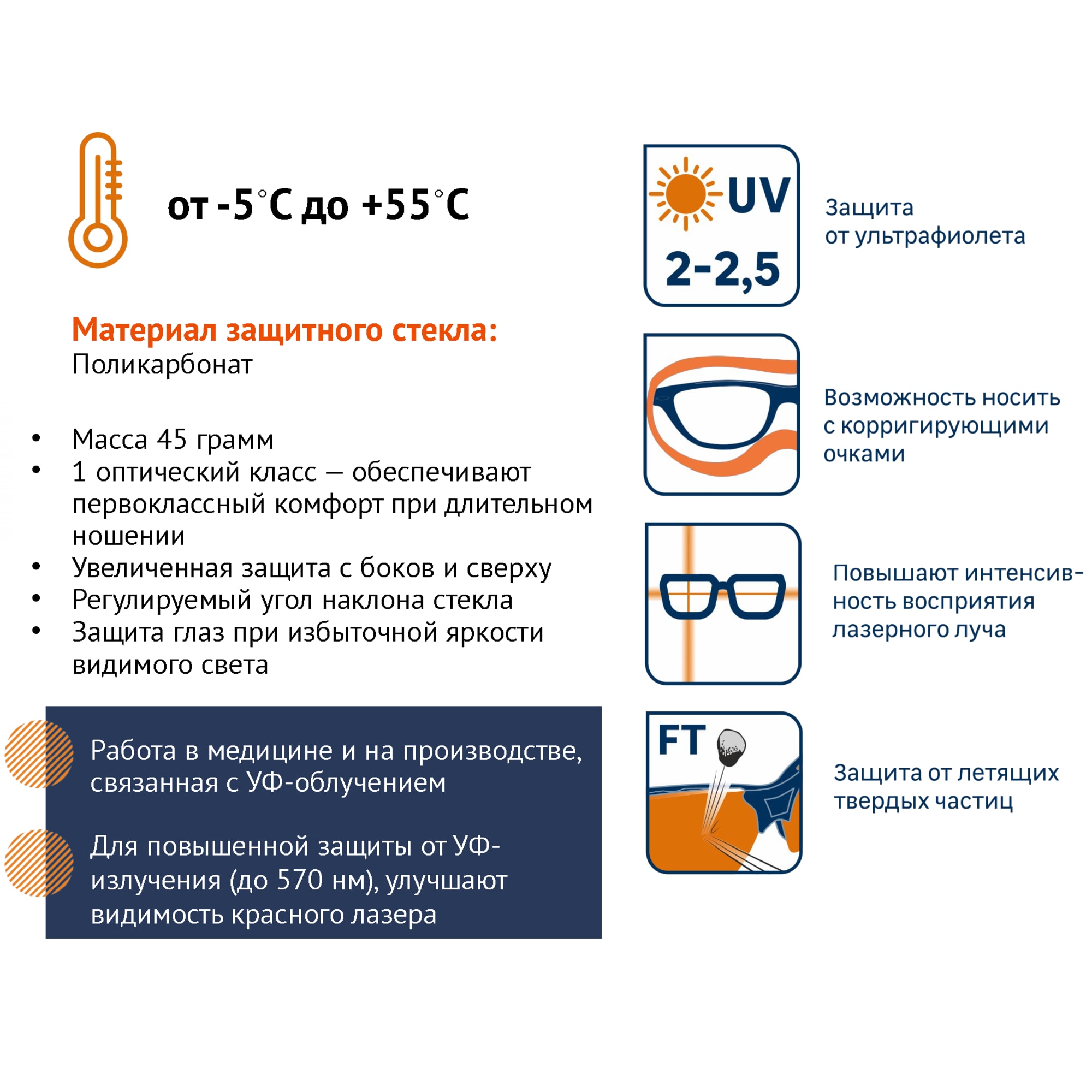 • Возможность использования вместе с корригирующими очками