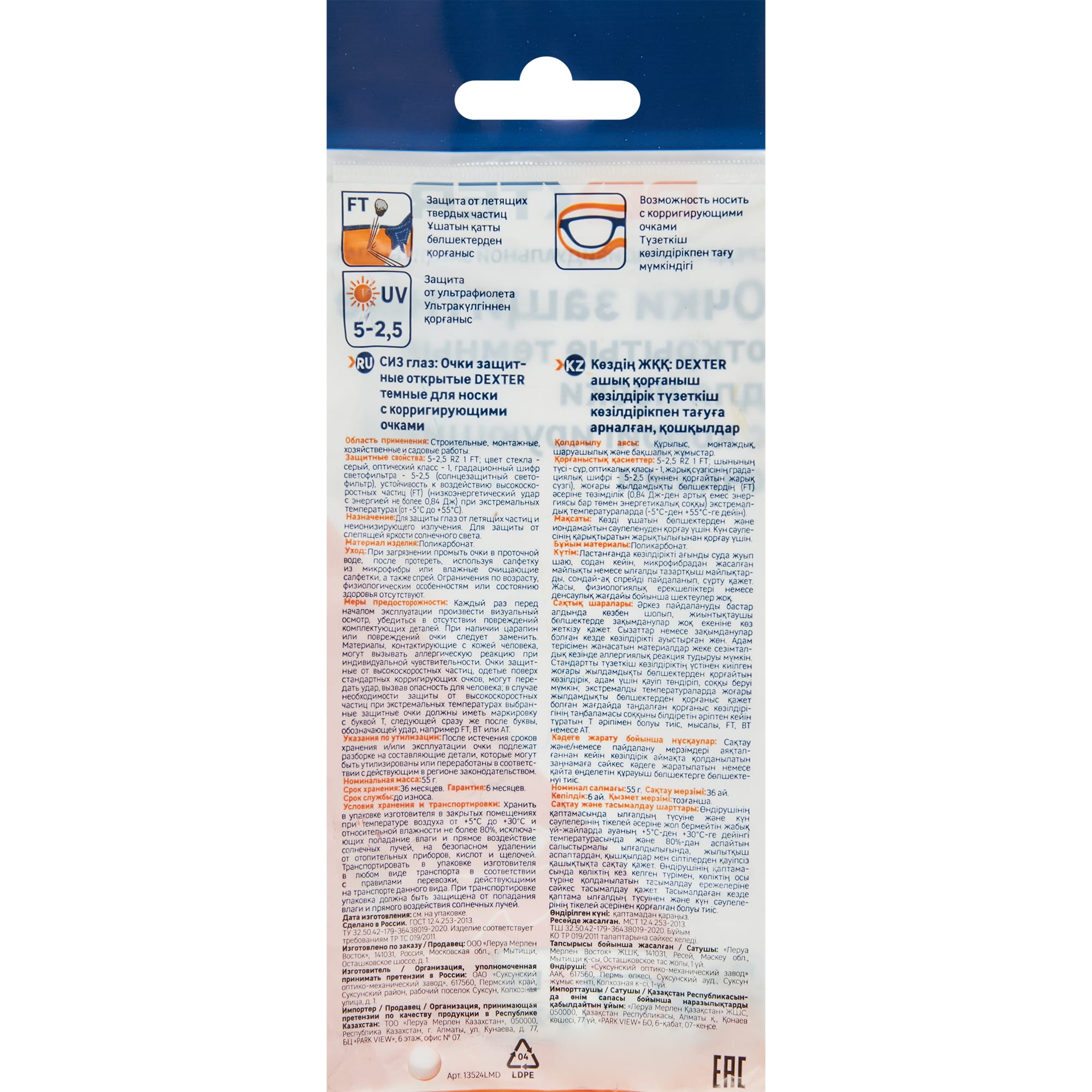Модель продукта Очки защ. откр. DEXTERтемны для нос.корр