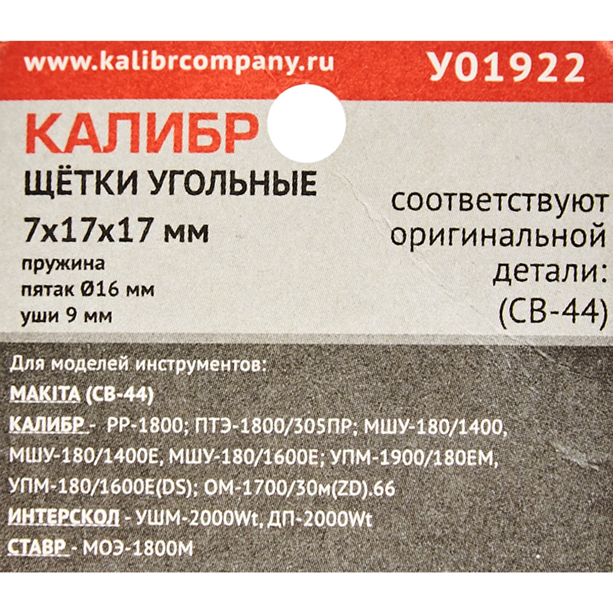 Щетки угольные Калибр У01922 — сменный элемент для двигателей электрических дрелей MAKITA. Соответствуют оригинальной детали 191963-2 CB-303. Полный перечень совместимых инструментов представлен на упаковке.