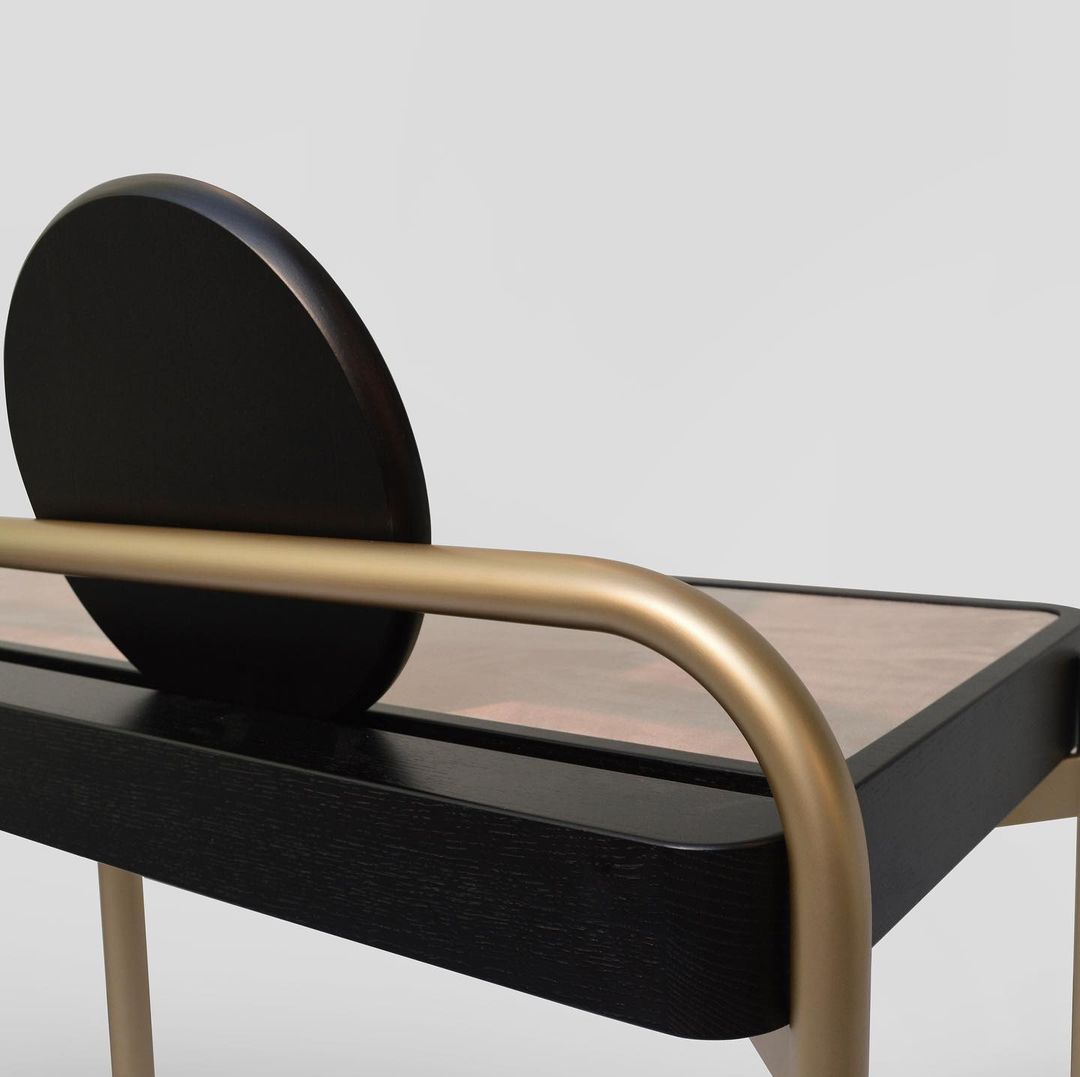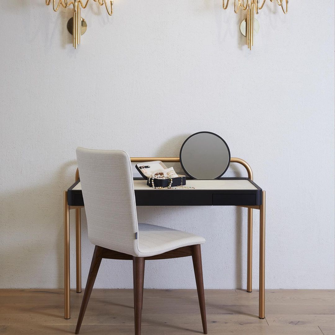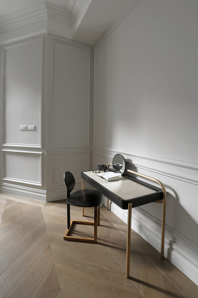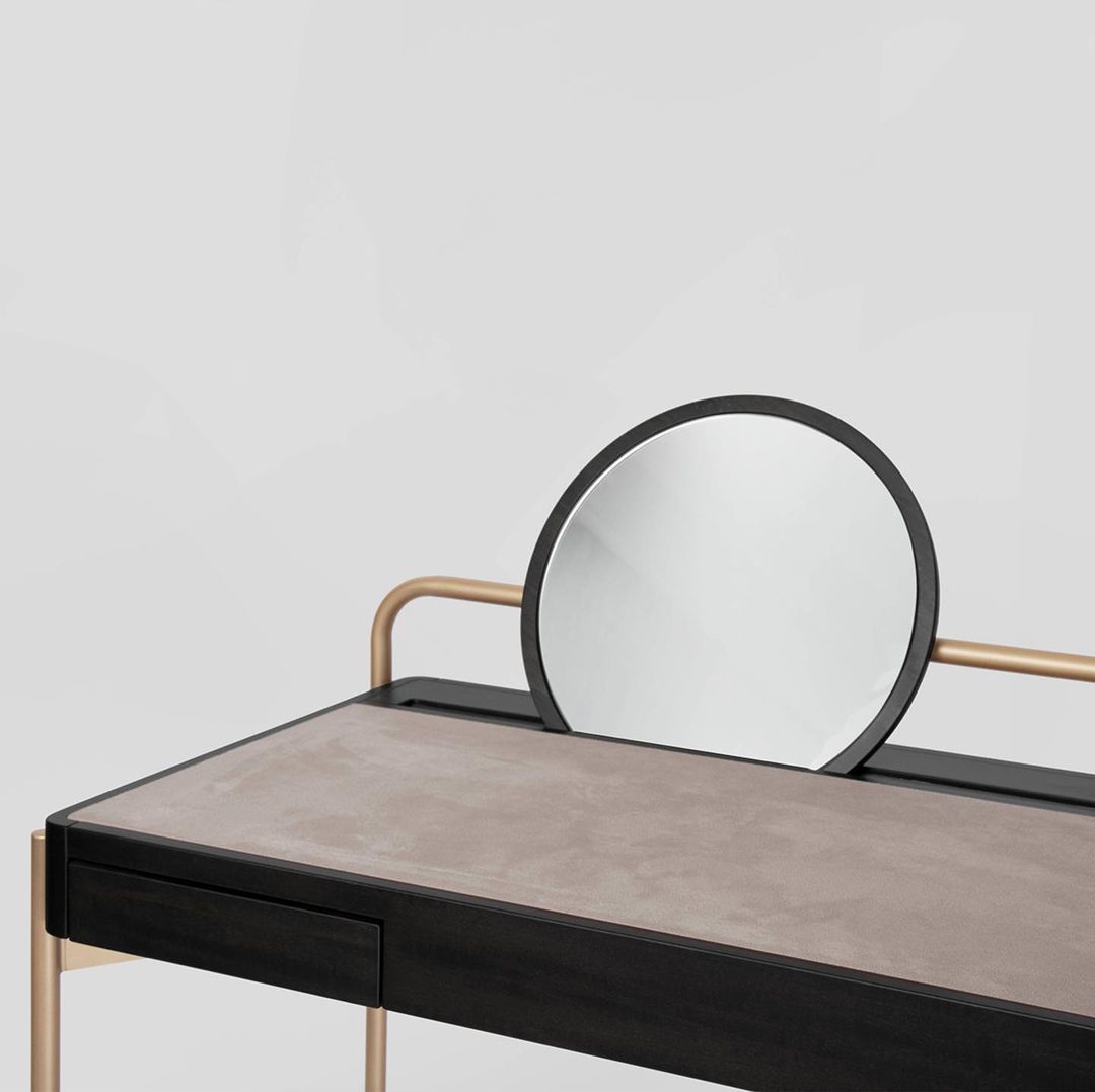 Письменный стол днем и туалетный столик ночью; Рулонный стол 02-это минимальная деталь с четырьмя металлическими ножками, поддерживающими столешницу из цельного дерева. Верхняя часть обита замшей или кожей для комфорта и удобства использования. Задние ножки выполнены из одной непрерывной петли, которая служит опорой для свободного зеркала с деревянной спинкой, которое перекатывается из стороны в сторону. Рулонный стол 02 доступен в различных отделках из дерева и металла. Стандартная коллекция Обивки -Замша Коллекция обивки Премиум-класса - Кожа - Нубук Отделка Деревом - Темный Окрашенный Орех - Натуральный Грецкий орех - Белый Дуб - Любой Цвет RAL Металлическая Отделка - Сатин (Бронза, Латунь,Шампанское, Алюминий) - Полированный (Бронза, Латунь,Шампанское, Алюминий) - Любой цвет RAL Изогнутая стальная рама служит в качестве ножек и опоры для верхней части, которая привинчена на месте. Затонувшая замшевая или кожаная панель. Зеркало с деревянной спинкой. Размер туалетного столика 100 х 60 х 80 см высота стола 70 см