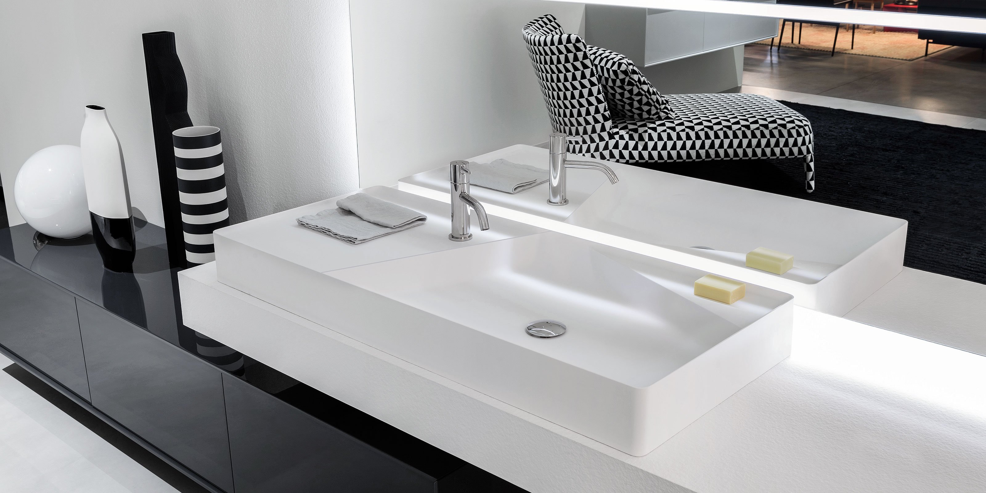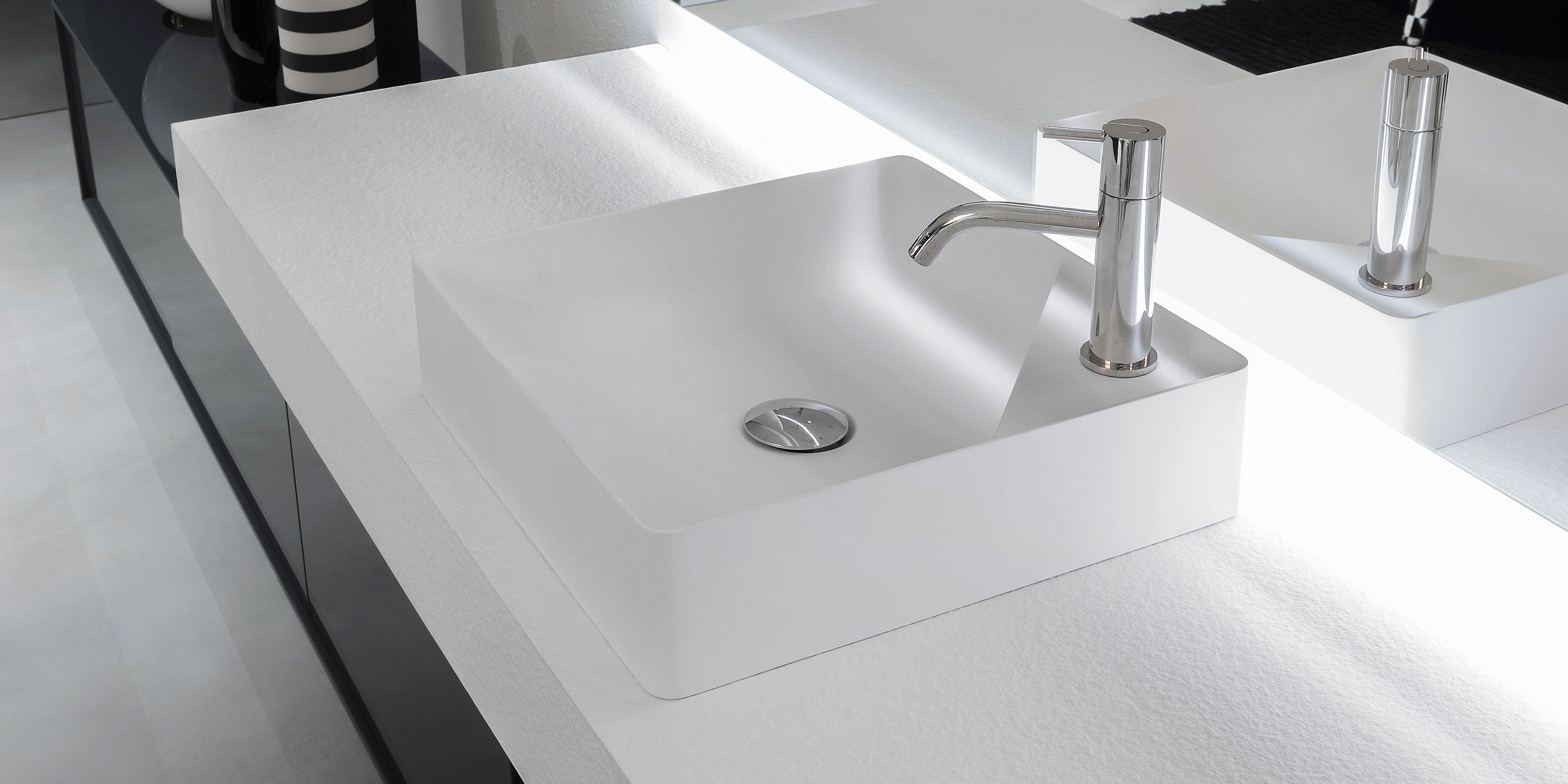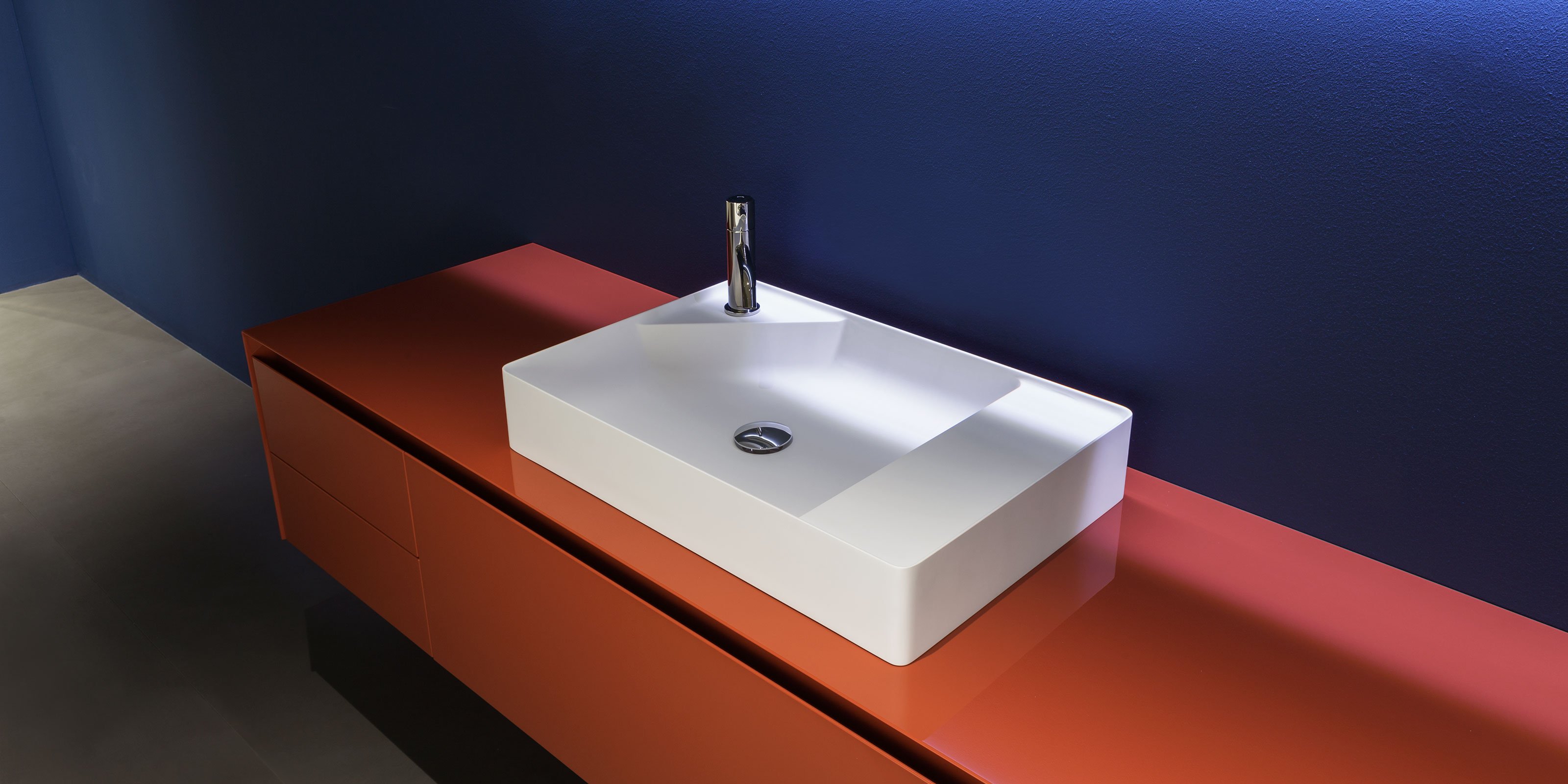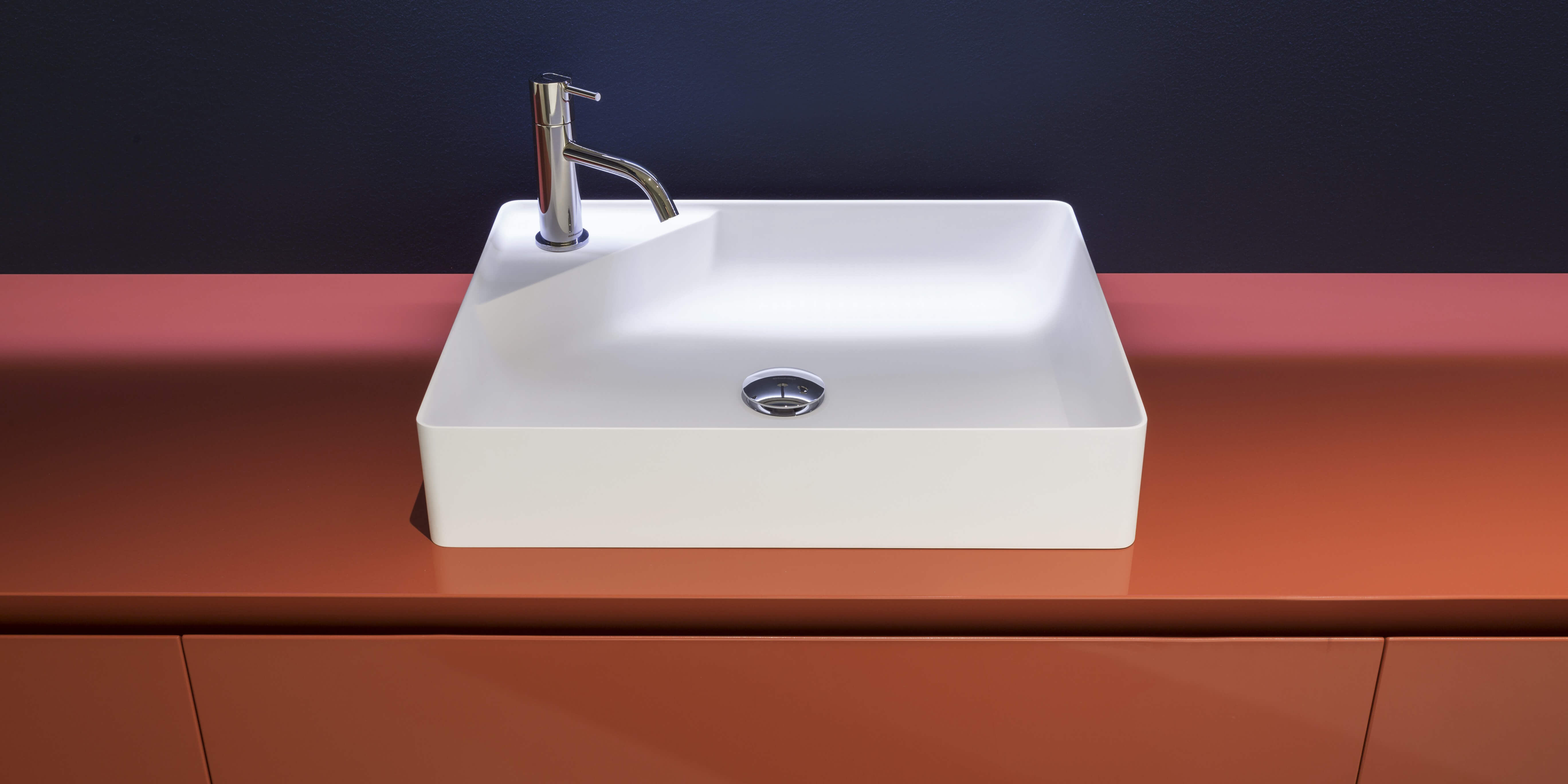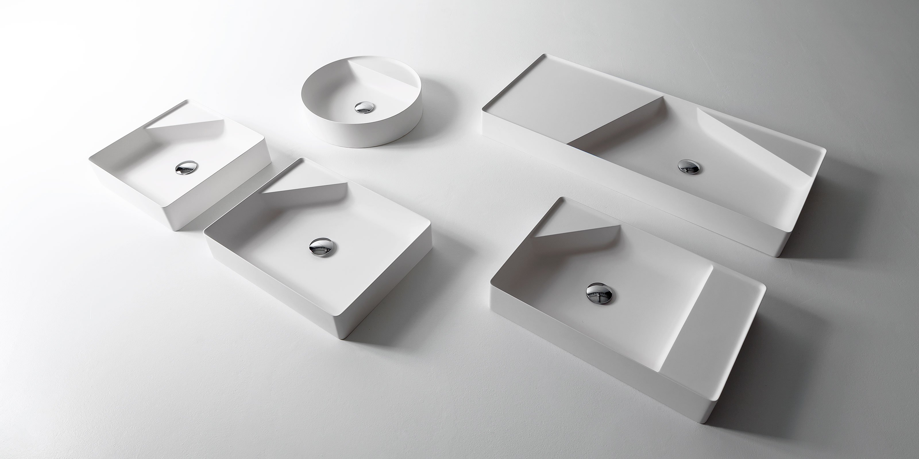 Элемент, поверхность для аксессуаров, всегда друг раковины. Функциональное присутствие, необходимое для повседневного использования, порождает новую форму, суть самого проекта. Simplo - это полное семейство умывальников из Flumood o Colormood, в которых часть раковины занята поверхностью: иногда она срезает угол, другие делят пространство по диагонали, а в другом случае следует за одной из параллельных сторон. Эта поверхность создает новый полезный объем и превращает круглые, квадратные и прямоугольные бассейны с тонкими краями в формальные композиции. Этот аксессуар становится главным героем, а его функциональность становится формой.