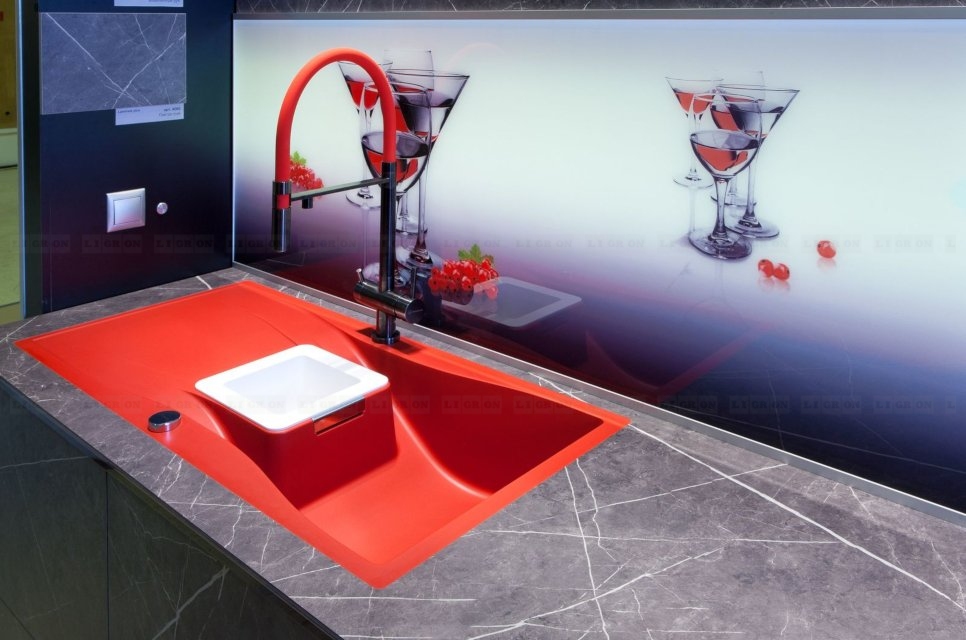 Предлагаются врезные мойки в один уровень со столешницей снизу (только компания Ligron врезает мойки в один уровень со столешницей из ламината снизу. Причем гарантия на все виды врезки моек – 5 лет). В один уровень со столешницей можно врезать разделочный элемент из кварца или керамики.