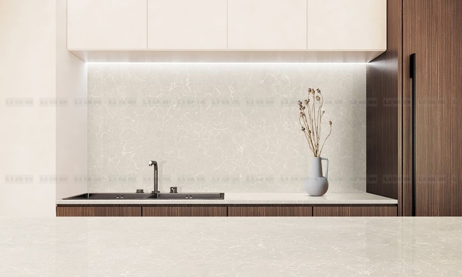 Обладает высокой теплостойкостью, стеновые панели можно размещать непосредственно за газовой варочной панелью. При этом ставить горячее на поверхность кварца нерекомендуется.