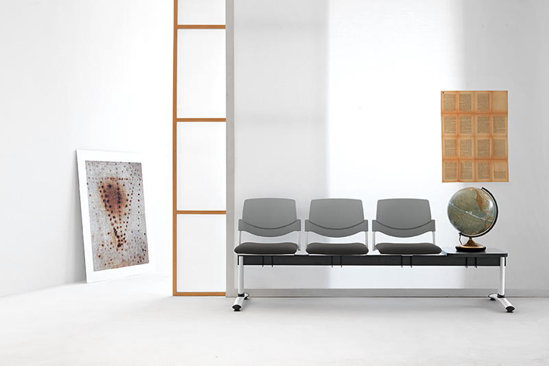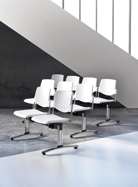 Система скамеек на 1-4 места. Полированная или окрашенная хромированная основа, пластиковое сиденье и спинка или мягкая подкладка. Может быть оснащен письменным планшетом.